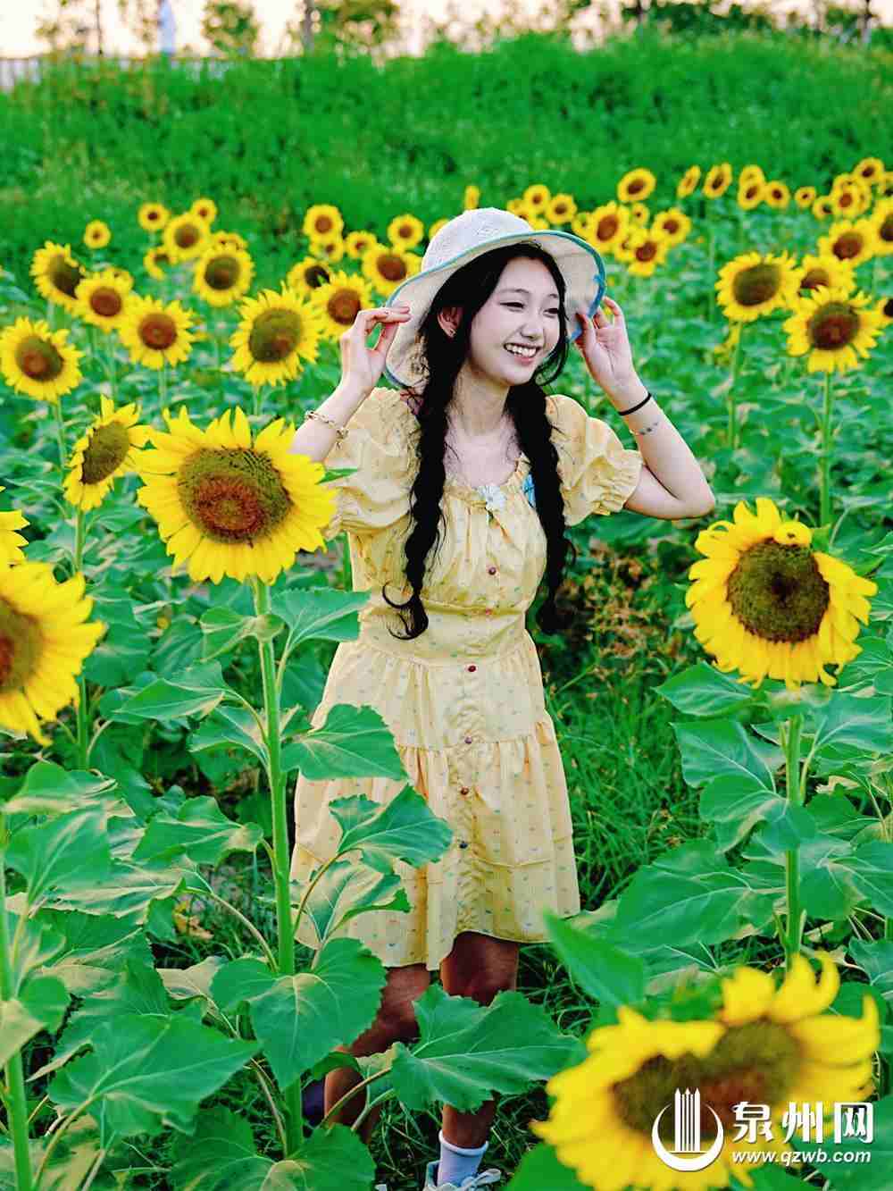 搭配浅黄裙、草帽拍照,清新感拉满。