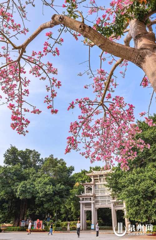 泉州中心市区芳草园广场,异木棉盛放,粉色花瓣缀满枝头,如霞似雾铺展秋日浪漫,成为一道美丽的风景线。 (融媒体记者 陈起拓 摄)