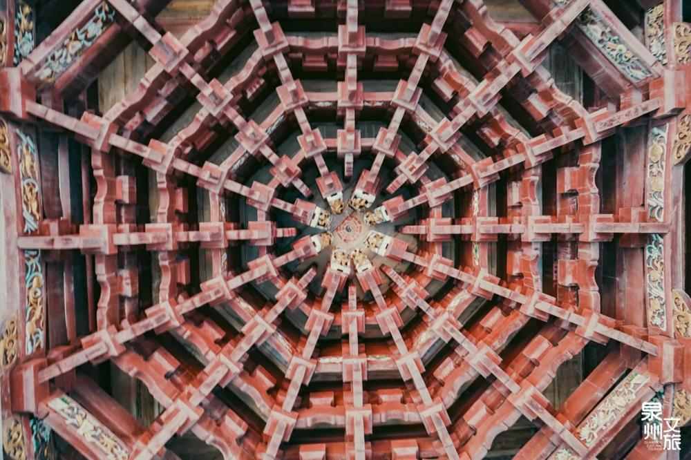 在泉州抬头,最先撞进眼里的是古建筑的“空中剧场”。走进泉州的寺庙,先让人屏息的往往是殿内的藻井。“交木如井,画以藻文”这句话,说的便是藻井。天后宫戏台上有一处木构藻井顶盖,层层叠叠,雕脊画枋,让人惊叹。
