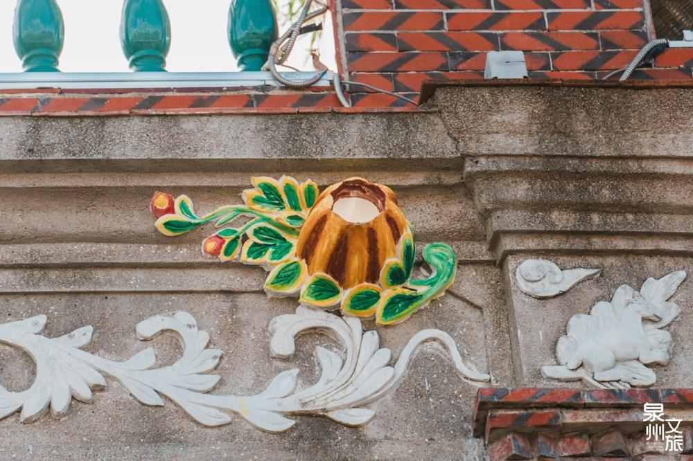 常在泉州的番仔楼中,看到天花顶,它又叫“灯花”。题材丰富,人物、花鸟、瑞兽等等,多由剪瓷雕、泥塑、彩绘等勾勒出立体造型或者平面图案。一眼望去,争奇斗艳,犹如赏花灯。