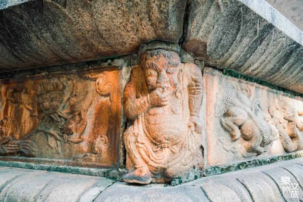 若说抬头看的是泉州的“大气”,那低头看的,就是泉州的“细腻”。闽南传统建筑中,角梁或塌寿柜台脚常雕有“憨番抬厝角”的形象,多为力士形象。开元寺仁寿塔的须弥座束腰转角处,便有八个“托塔力士”,袒露着上身,动作各异,别有趣味。