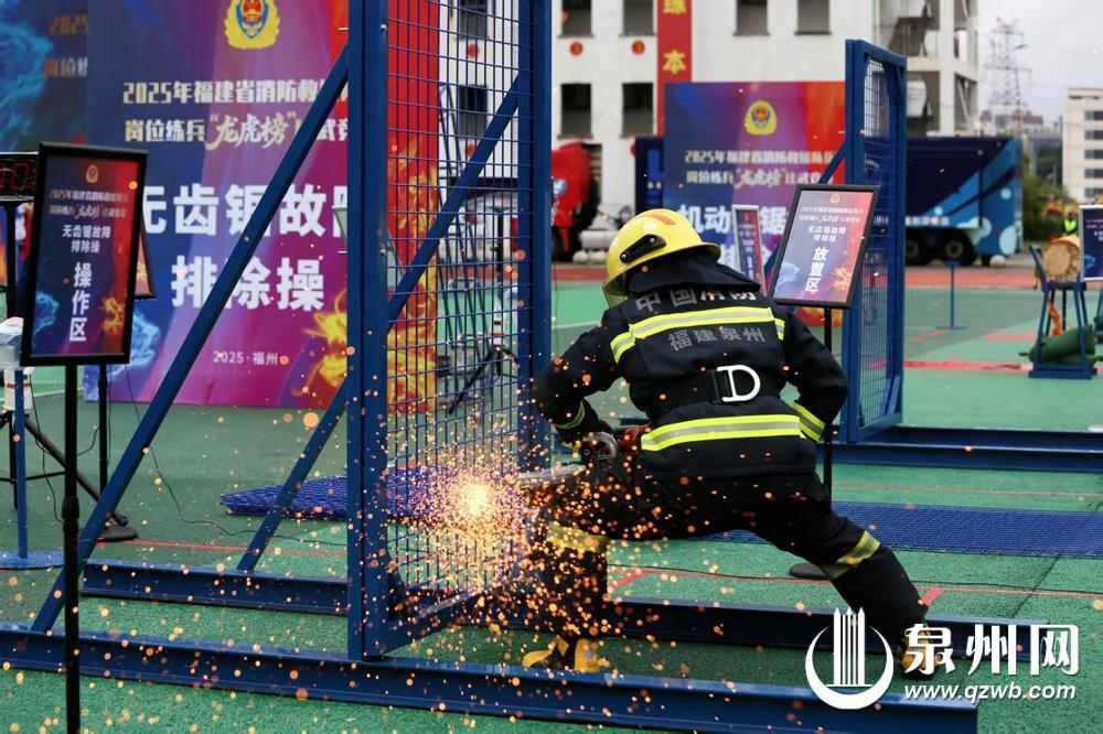 无齿锯故障排除操中,争分夺秒地更换高压包、锯片,快速穿戴好装备到切割区锯断铁丝网;无人机侦查技能比赛中,操控无人机依次飞过障碍板、龙网,飞到热源侦查区域进行热源侦查;高层建筑火灾扑救协同综合抢险救援比赛中,迅速完成着装登车,驾驶参赛车辆依次通过单边桥、进行途中清障、通过直角转弯,同步开展火情侦察、外部控火、内攻搜救……10月21日上午,2025年福建省消防救援队伍岗位练兵“龙虎榜”比武竞赛拉开帷幕。赛场上,泉州市消防救援支队参赛指战员以优良的作风和过硬的素质,展现“能谋善战、敢拼善赢”的泉州消防精神。