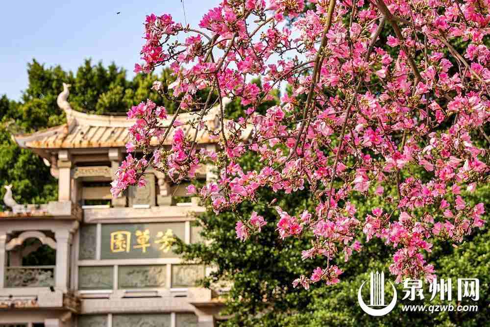 若想感受更丰富的秋冬色彩,不妨前往小山丛竹与芳草园。这是近距离、沉浸式拥抱秋冬繁花的好地方。小山丛竹公园是泉州旧八景之一的园林,既藏着朱熹讲学的文脉,也留着弘一法师圆寂的晚晴室。诚正堂边,几棵栾树枝繁叶茂,黄的花、红的果层层叠叠,风一吹便簌簌落在地上,星星点点很是浪漫。逛累了,可到书院图书室小坐片刻,或于过化亭歇脚。秋冬之际的芳草园是另一番明媚。两排异木棉正热烈盛放,粉色花朵层叠如霞,在阳光下格外绚烂。漫步其间,仿佛踏入粉色童话世界,花香萦绕,每一步都踩着秋冬的浪漫,让松弛感在行走中慢慢沉淀。