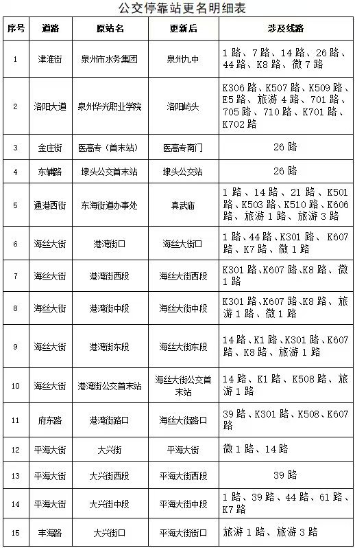 12月15日起,泉州公交将增设、调整、重命名部分公交站点。其中,7条线路增停8个已有中途站点,3条线路取消停靠单个中途站点,15个站点重新命名,1条线路调整首末班发车时间,3条线路重命名。小伙伴们,看看有你家附近有没有调整