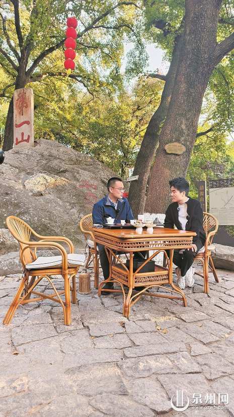 “原本想说很多话,但到了这儿没有特别想说的,只是做了在这里该做的事:慢慢聊天,享受日光和景色。”夕阳穿过树梢撒下金黄的细碎,董宇辉与纵纬坐在树下品安溪铁观音,聊起泉州的姜母鸭、面线糊,问起山间的桂花、榕树、树葡萄,忆起南方的一场大雨。夕阳映照清源山主峰时,他提到一位纪录片导演:“导演说拍完《河西走廊》后很多年不再拍大型历史题材,但泉州是他特别想拍好的地方。”