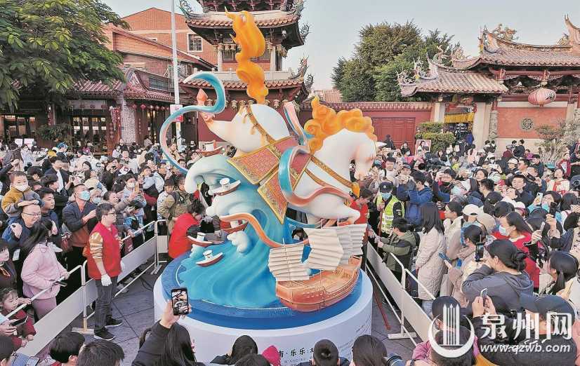 1月16日下午5时,泉州古城马年生肖IP“六合同风马”系列第三款艺术装置“南·乐乐”在德济门遗址广场正式亮相,《因为刺桐》“郑和怒海”剧目的杂技片段同步上演。