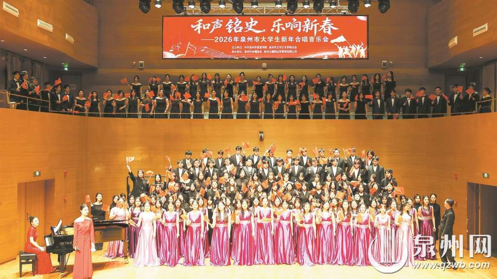 日前,“和声铭史 乐响新春”2026年泉州市大学生新年合唱音乐会在泉州大剧院举行,以青春之声叩响新年大门,用和声之美铭刻时代旋律。