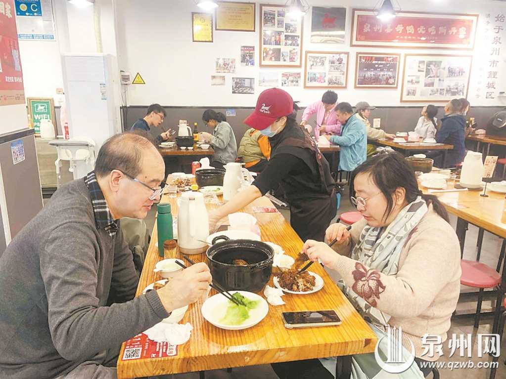 “这道姜母鸭口味十足,很合胃口,我们两人都光盘啦!”来自湖南的陶女士对姜母鸭赞不绝口。她和姐妹王女士从广东一起来泉州旅游,在朋友推荐下,这三天已逛了开元寺、府文庙等景点,也品尝了面线糊、炸醋肉等特色小吃。在即将离开泉州的下午,能品尝到姜母鸭这样咸香醇厚、油润不腻,既符合泉州古早味,又符合她“重口味”饮食习惯,二人心情十分愉悦。