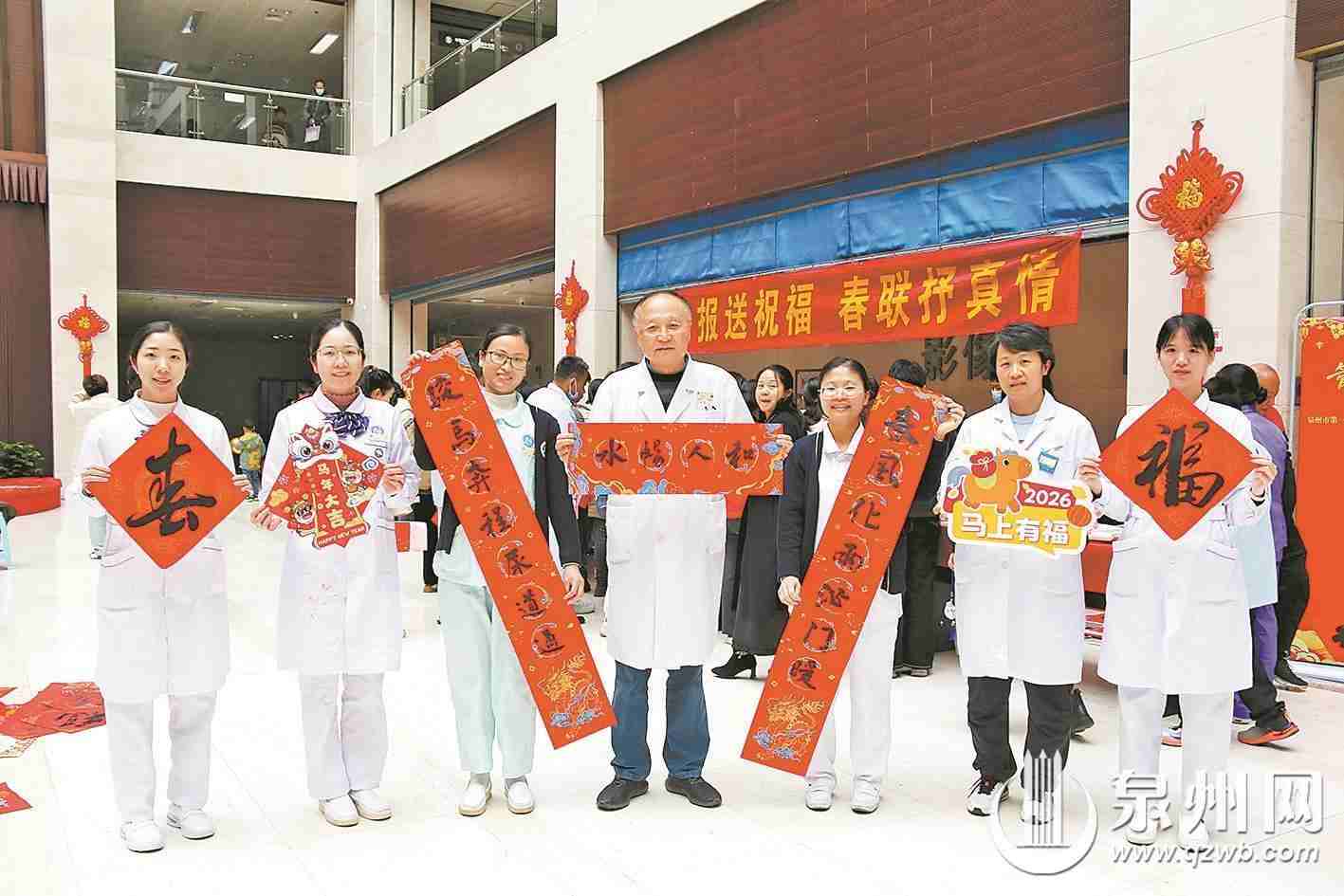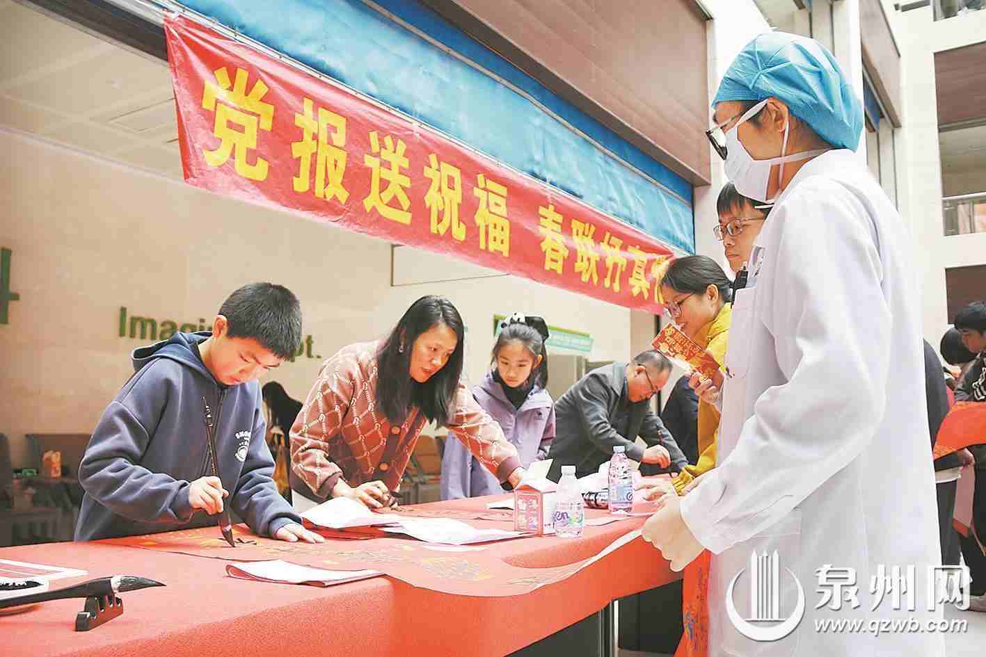 昨日上午,泉州市第一医院城东院区洋溢着温馨祥和的新春氛围,“党报送祝福 春联抒真情”活动走进该院,同期还举行了“我们的节日·春节”主题活动。活动以“管弦奏新韵 笔墨绘吉祥”为主题,将新春音乐会、手写春联、趣味互动等特色环节相融合,为坚守岗位的医护人员、就诊患者及家属送上满满的新春祝福,让墨香与暖意萦绕医院各个角落。