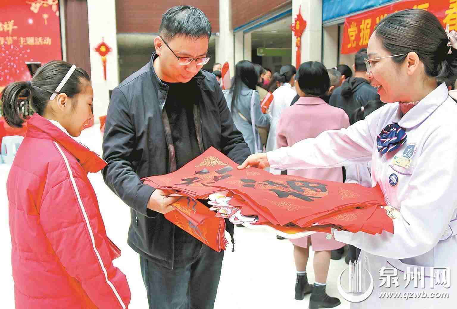 活动现场,来自泉港的刘先生一家来院就诊,路过活动现场便驻足参与。他带着妻儿求取春联,期盼新的一年阖家幸福、平安健康。医院的一对医护夫妻也携手而来,共同挑选春联,为小家增添新春喜庆。