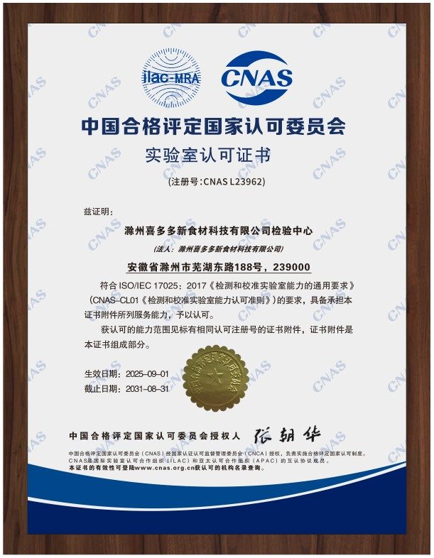 滁州喜多多新食材科技有限公司检验中心荣获CNAS国家实验室认可认证 ——以国际标准赋能食品检测,筑牢质量安全新标杆