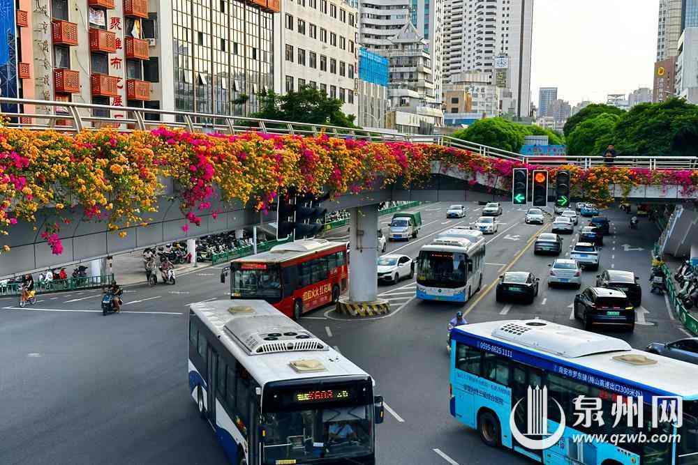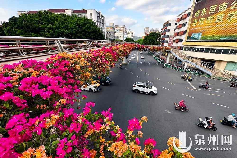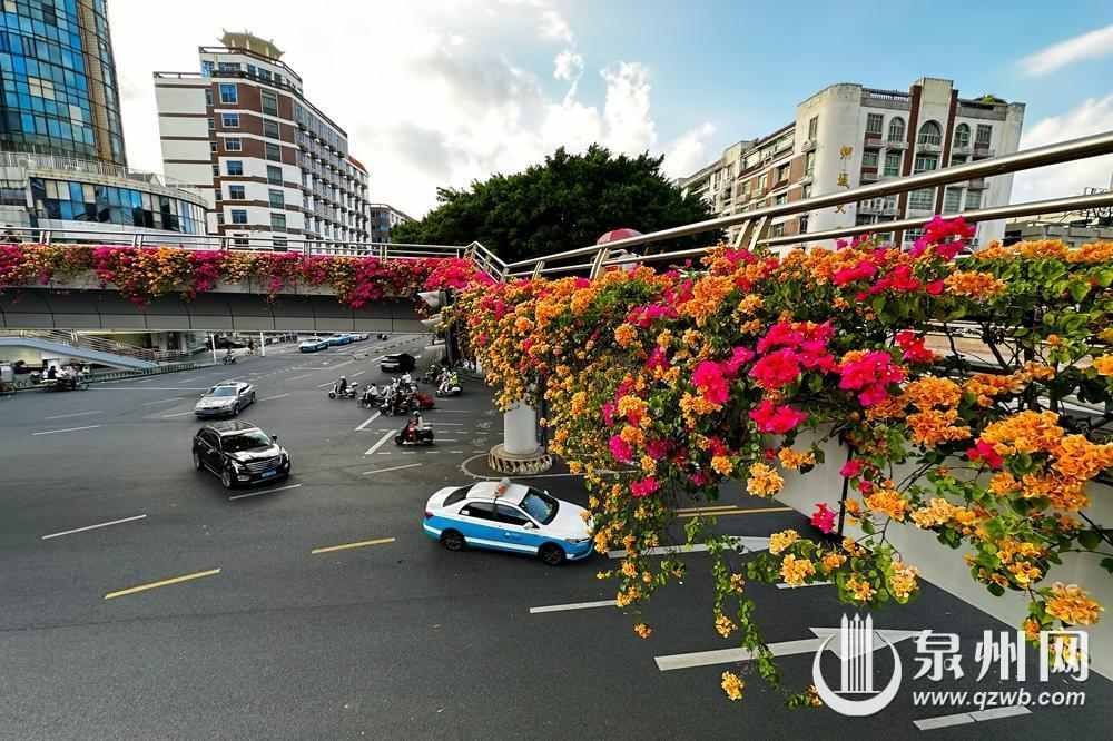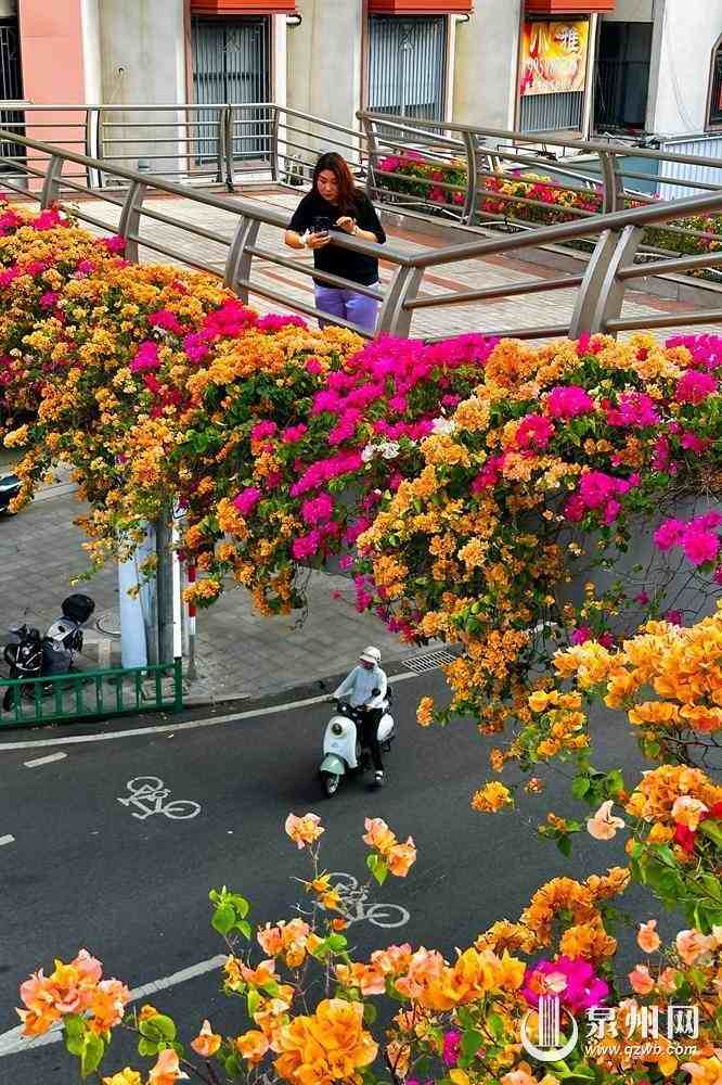 连日来,泉州市区温陵路与津淮街交叉口人行天桥被绽放的三角梅绚烂色彩晕染得格外动人。橙黄、粉紫的花瓣肆意舒展,层层叠叠地缀满天桥护栏。如瀑布般垂落的花枝,为硬朗的天桥披上了件活泼又雅致的 “花衣”,也为城市勾勒出一幅清新自然的画卷,吸引不少过路市民拿起手机将这满眼缤纷收入镜头。